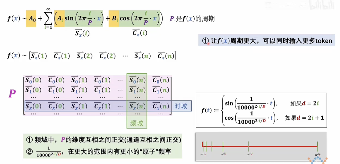 位置编码本质上是一个周期函数的离散展开,每一维对应傅里叶级数中的一个频率分量。通过这种方式,模型可以在不同尺度上感知位置信息,同时保持结构的规律性和可扩展性。