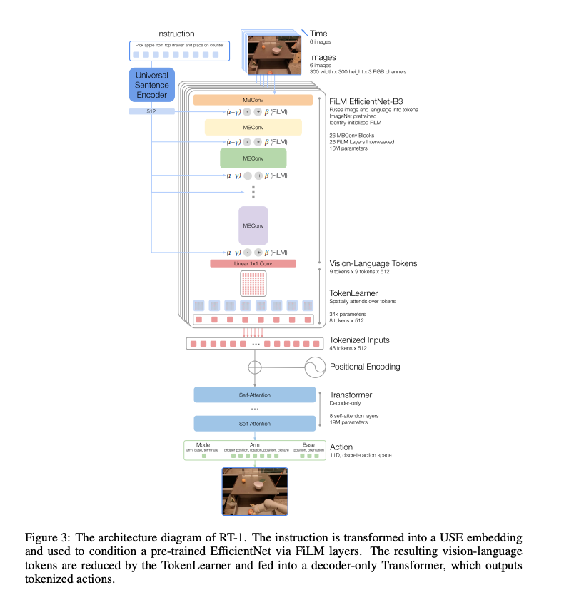 - Token学习器模块: 在图像和文本处理之后,RT-1架构的一个关键组件是Token学习器模块。该模块负责从处理过的视觉特征中计算出一组紧凑的Token,然后将其输入到Transformer中。这一步骤对于效率至关重要,因为Transformer网络(尽管容量大)需要保持相对较小(仅接收48个Token作为输入),以确保快速推理和对人类用户的响应能力。这表明它专注于为Transformer提供高度压缩的相关信息。
